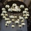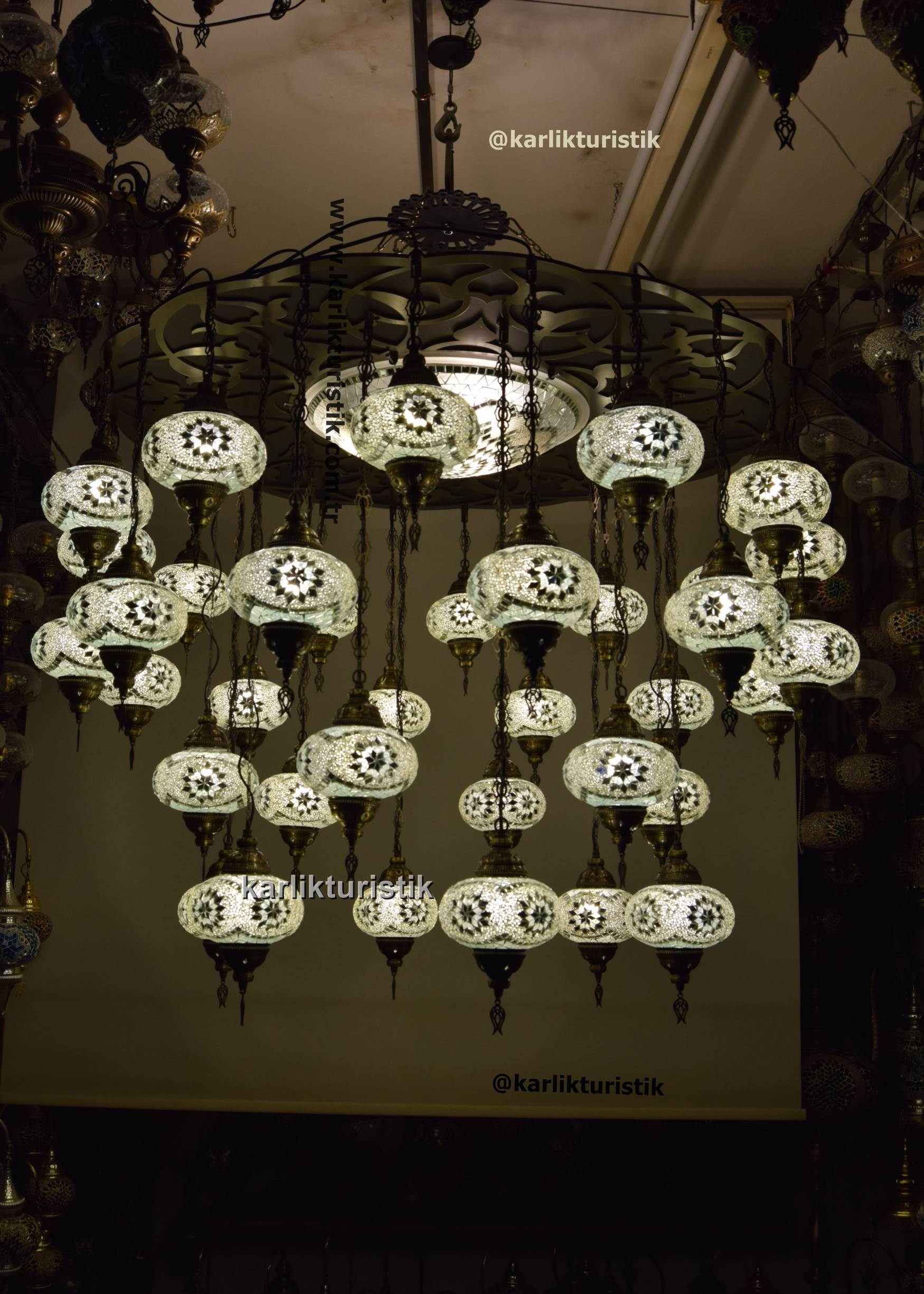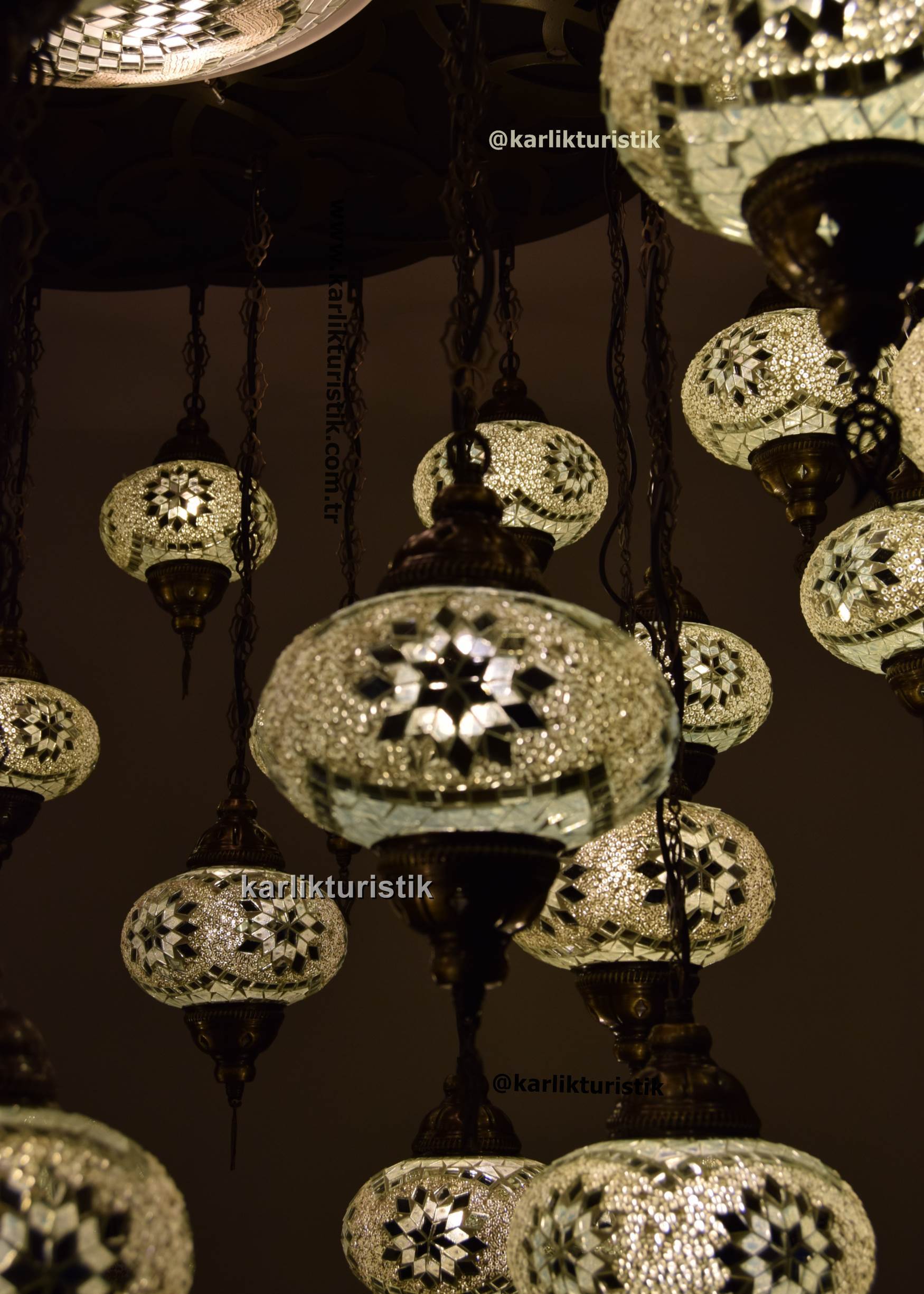 Ekstra Büyük ,Beyaz Tonlu, Mozaik Avize – 34 Camlı Ortası, 50cm Sarkıt Lamba Bombe