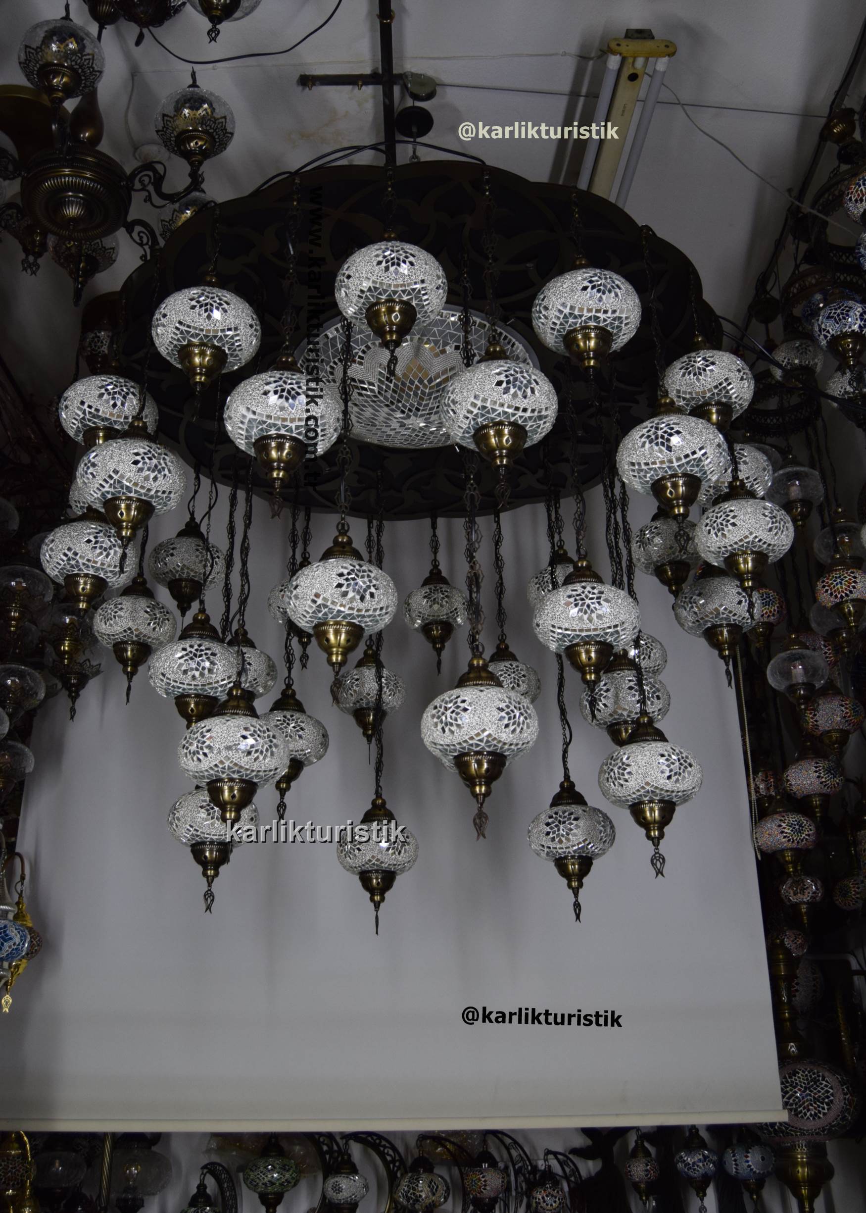 Osmanlı sanatının zamansız zarafetini evinizin kalbine taşıyın. Bu muhteşem, 34 başlıklı el yapımı mozaik avize; usta eller tarafından titizlikle bir araya getirilmiş cam ve boncukların büyüleyici ışık oyunlarını sunar.