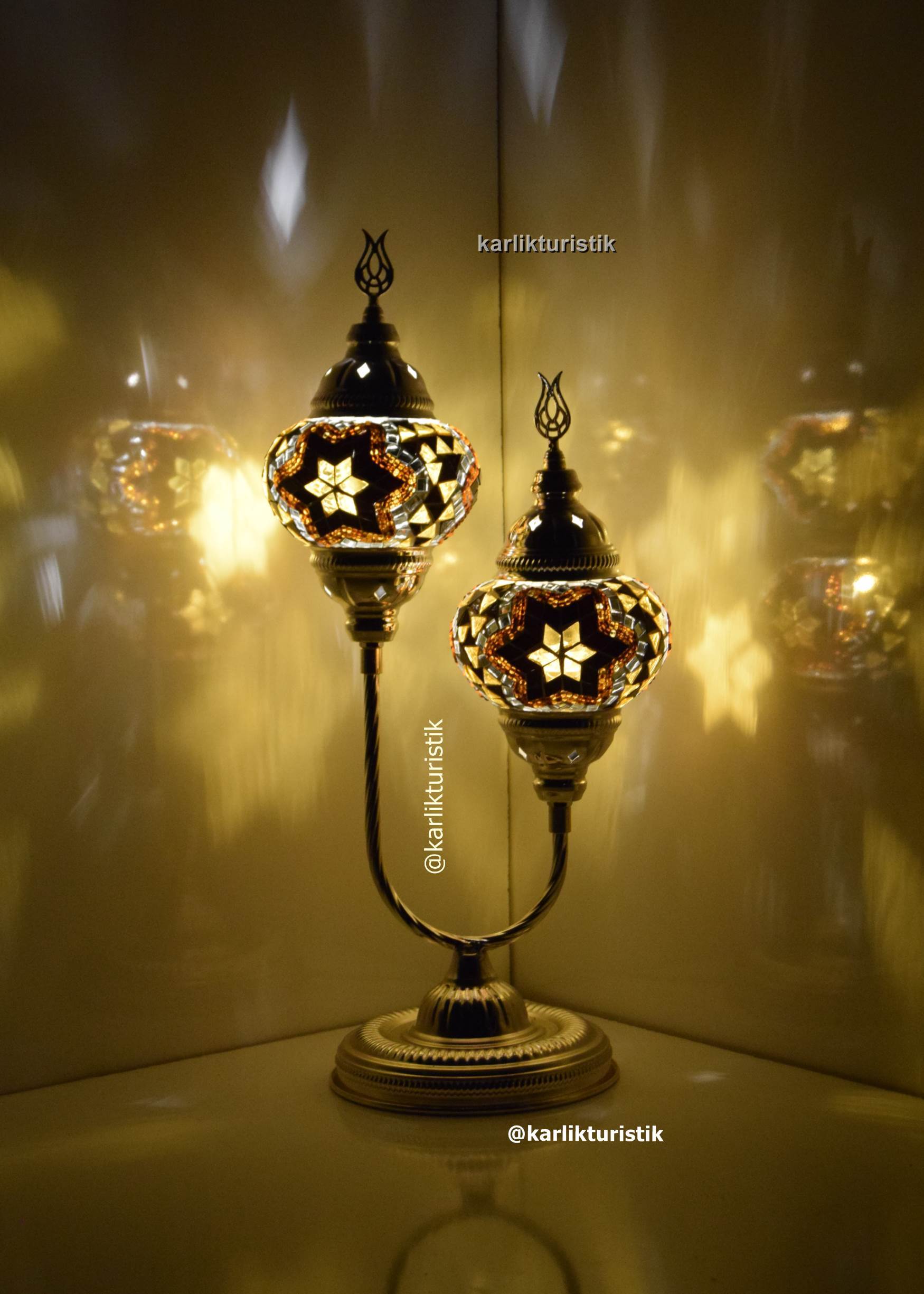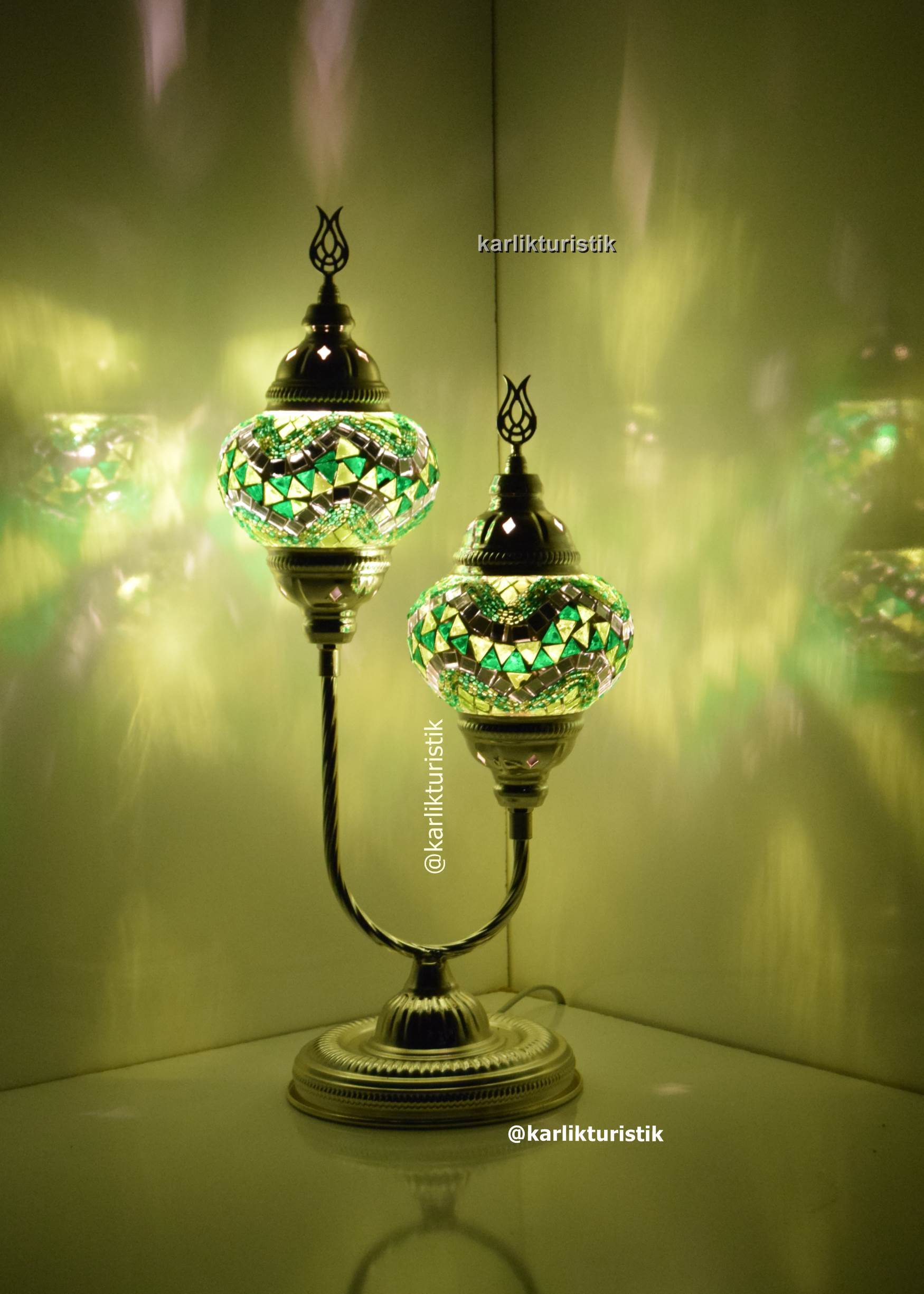 Hediyelik Eşya ,Mozaik Masa üstü Lamba ikili U abajur gümüş kaplama