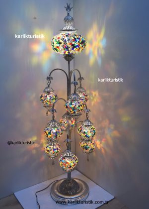 Türk el yapımı ayaklı lamba, Bakır Telkari Sanat 11’li Renkli Mozaik Camlı Türk Yer Lambası telkari sanatı bakır